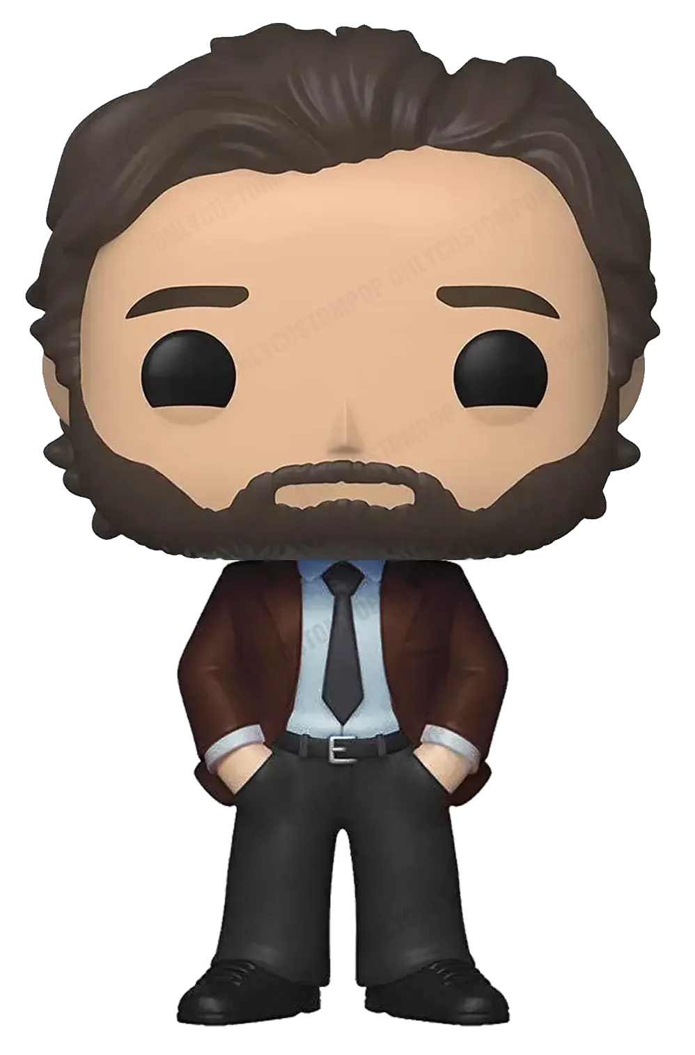 Joe Goldberg avec la tenue de la saison 4. Représenté avec ses cheveux long et sa barbe. 2 version possibles avec son costume marron, l’une avec sa tasse et son sac besace ou l’autre avec les mains dans les poches.